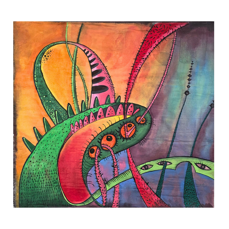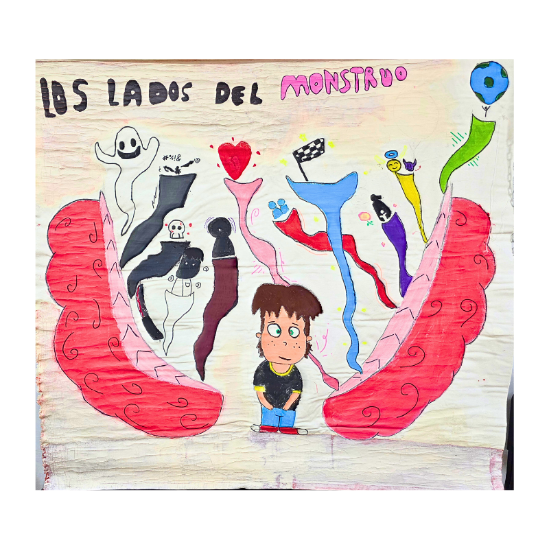El título está relacionado con ese chaval del cuadro hablando desde la hipocresía y la ignorancia (porque nunca ha tenido enfermedad mental) y le llama monstruo aunque el color rosa dice todo lo contrario.