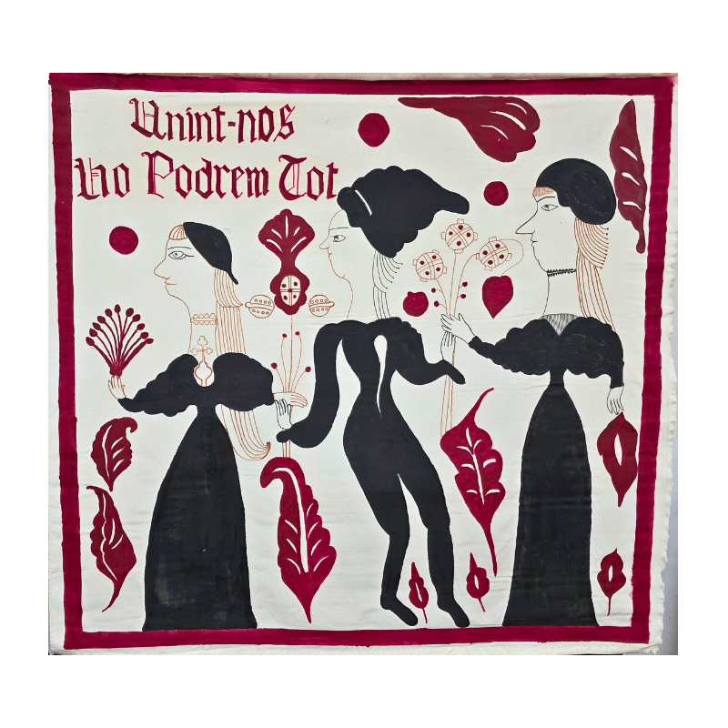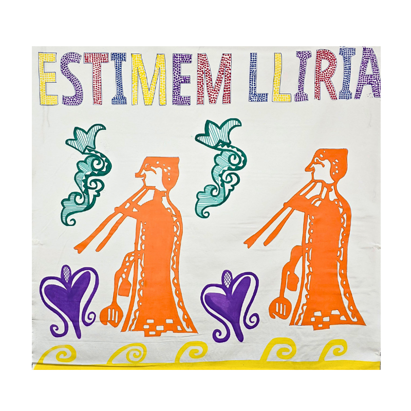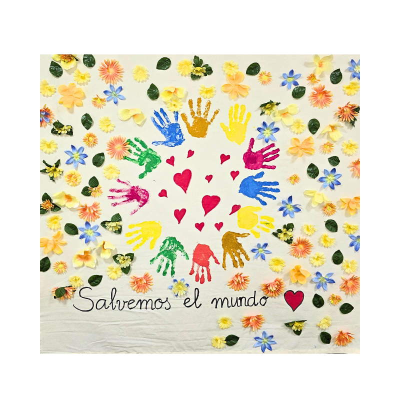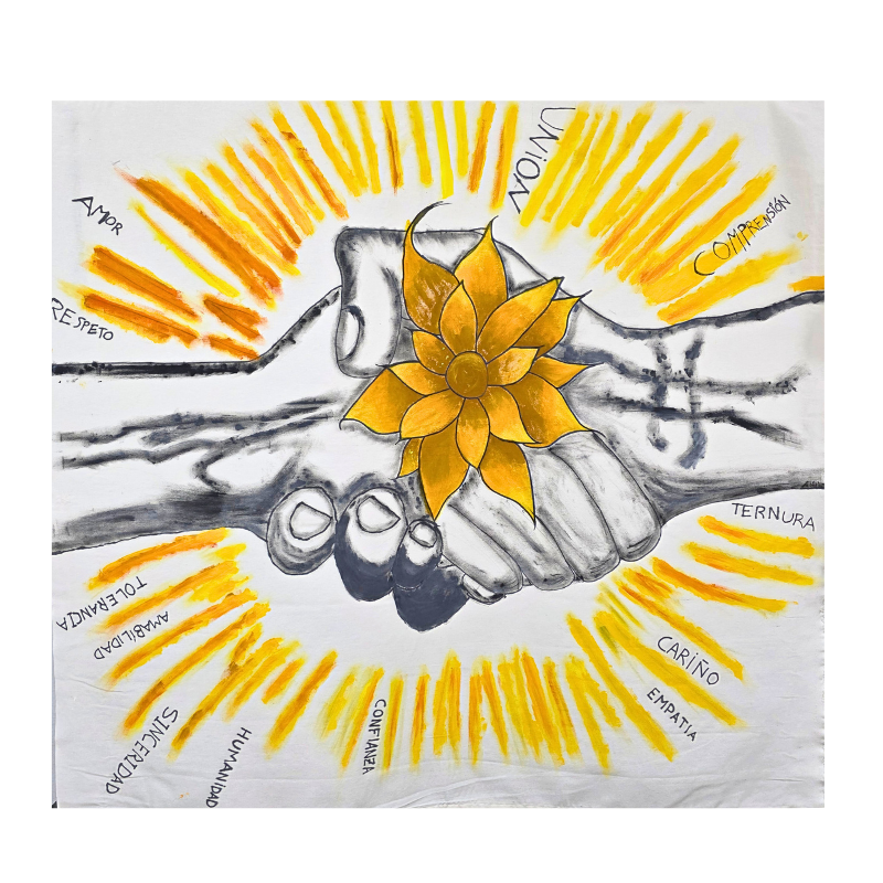 De la unión de las dos manos, nace una flor preciosa y amarilla, símbolo de la amistad. Alrededor de la imagen central de nuestra obra se extienden rayos de luz acompañados con palabras que, para nosotros representan todo aquello que significa unión y complicidad.