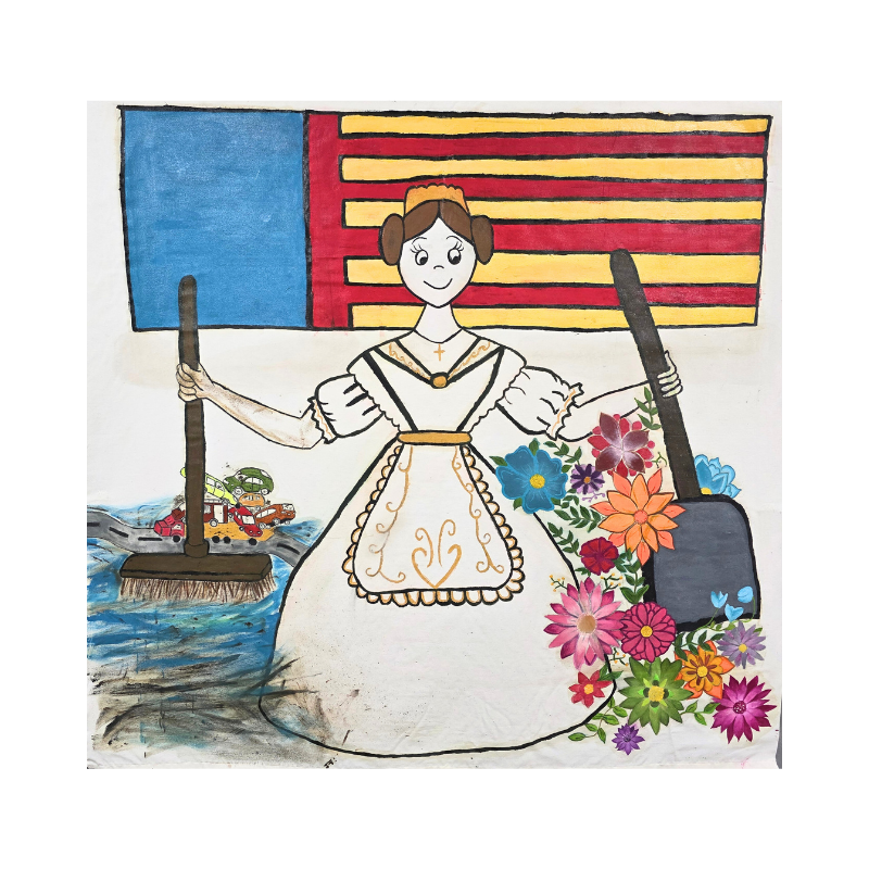 Destacamos la figura central de un escobón, que ocupa todo el lienzo, empujado por muchas manos representado la solidaridad y el desastre vivido en Valencia.