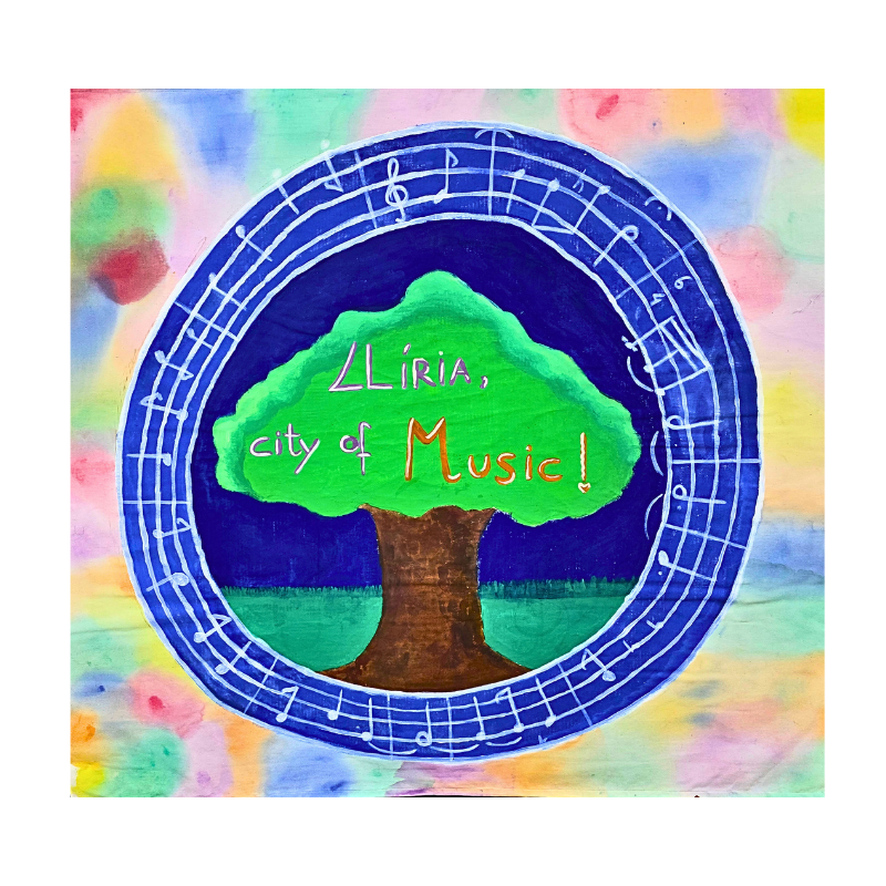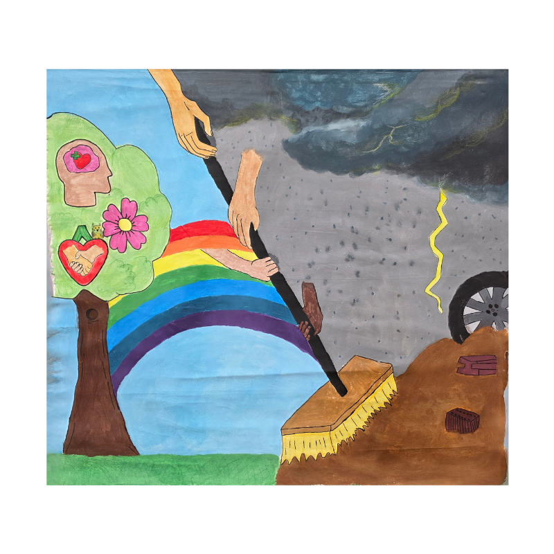 Se ve representado la parte derecha con tonos oscuros y con los desperfectos causados por la DANA y en la izquierda un paisaje limpio sin nubes y con un árbol en el que están los símbolos de la salud mental y la solidaridad.