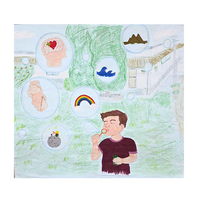 Vemos cómo el niño está con los ojos cerrados imaginándose temas importantes que ve en el día a día, como la solidaridad o la salud mental, y también la familia o lugares importantes para él.