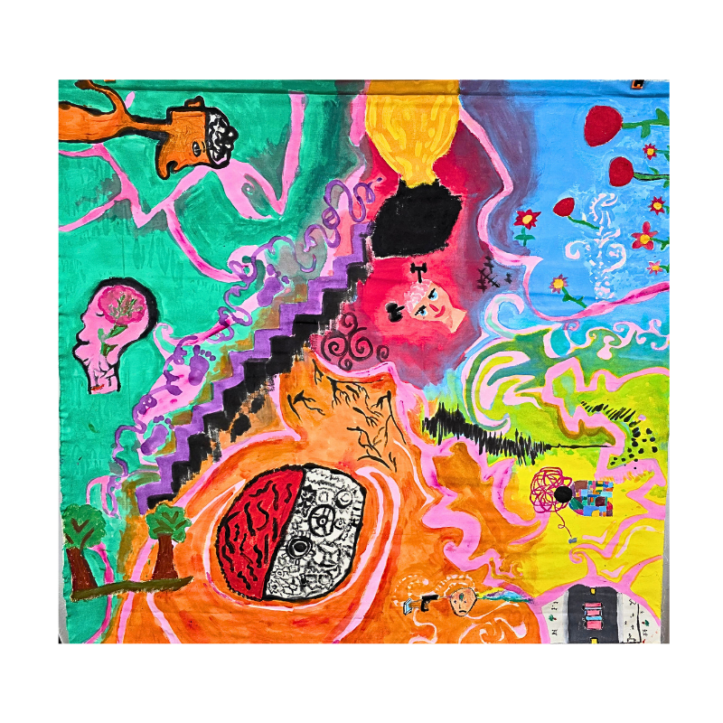 En esta obra queríamos representar la variable que puede ser la salud mental a lo largo de la vida, esta obra fue pensada llena de simbolismos: