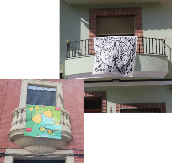 Esta balconada nace desde nuestros ojos, niños y niñas de 3 a 5 años. Son pequeños y ven el mundo con mucho color, como nuestra alegría. Somos niños y niñas muy diferentes entre nosotros: hay altos, con el pelo rizado, el color de la piel más oscura, con gafas…pero todos nos queremos, jugamos, bailamos, compartimos…todos juntos. Queremos un mundo así para vosotros mayores, así que esta mano representa los abrazos, caricias y ayudas que queremos que nos den los unos a los otros, y los círculos muestran que en la sociedad hay cabida para todos.